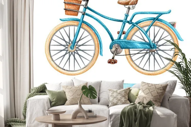 Naklejka: Ilustracja akwarele, rower niebieski, retro rower, puste wstążki