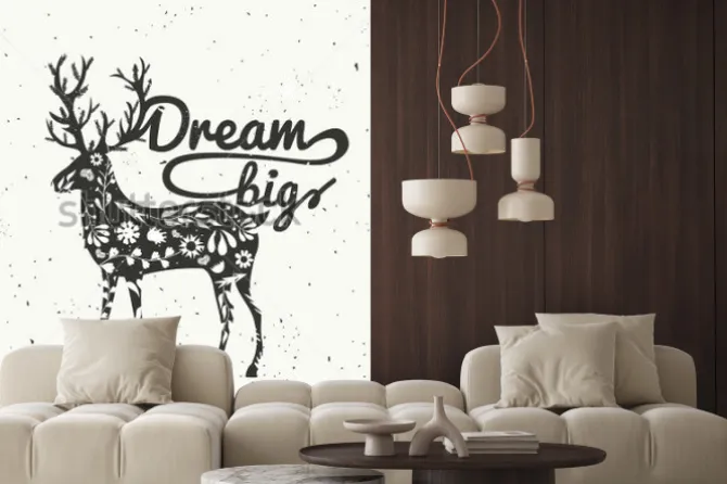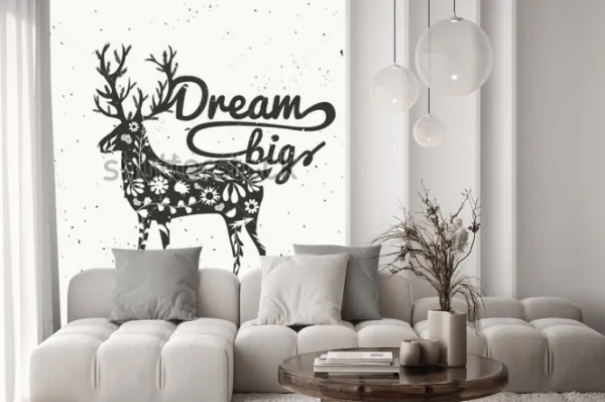Ilustracja z modną ręką w stylu czarny jelenia z kwiatowym wzorem i doodle gałązki. Miej wielkie marzenia. Ładny i stylowy druk z cytatem, wystrój domu, plakat w stylu vintage hipster.