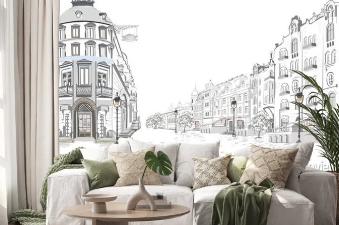 Naklejka: Ilustrowana ulica z zabytkowymi kamienicami
