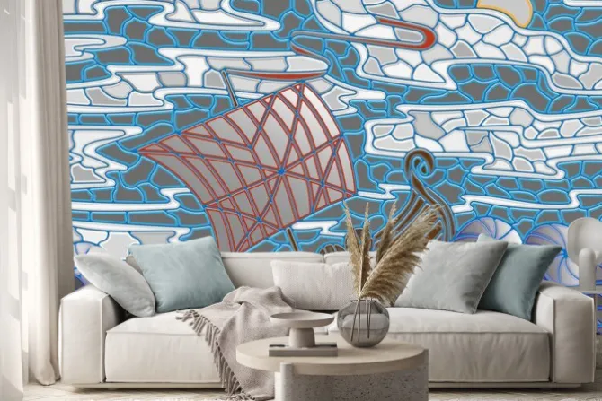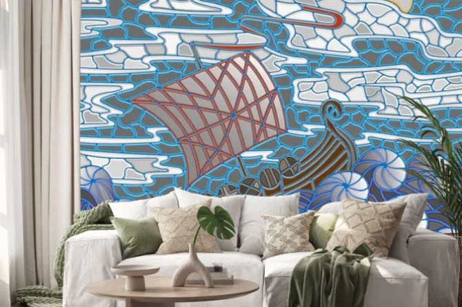 Naklejka: Imitacja witrażu z wikingowskim statkiem