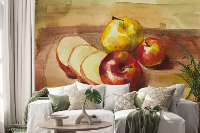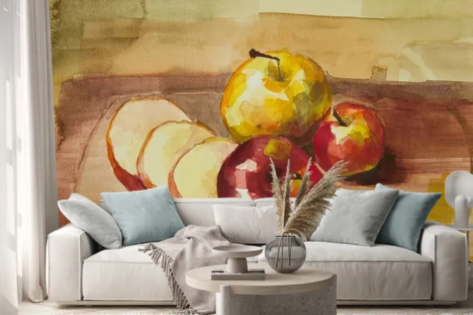 Naklejka: Jabłka na pokładzie cięcia wciąż życie akwarela malowanie
