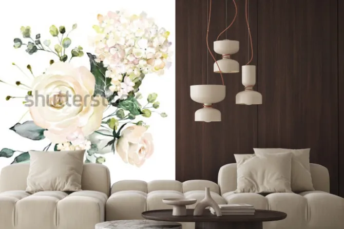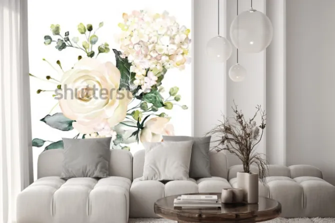 Naklejka: Jasne kwiaty hortensji i róż na białym tle