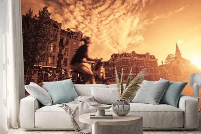 europa, Amsterdam, miasta, kolarstwo, ulice, rowery, kobieta, ludzie, czerwony