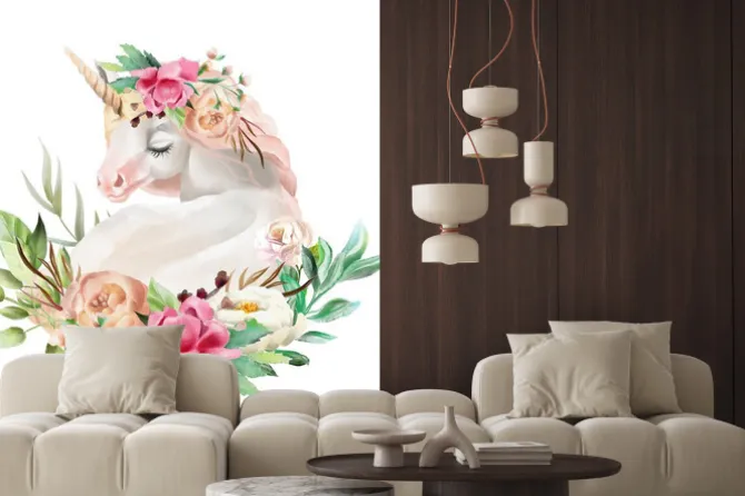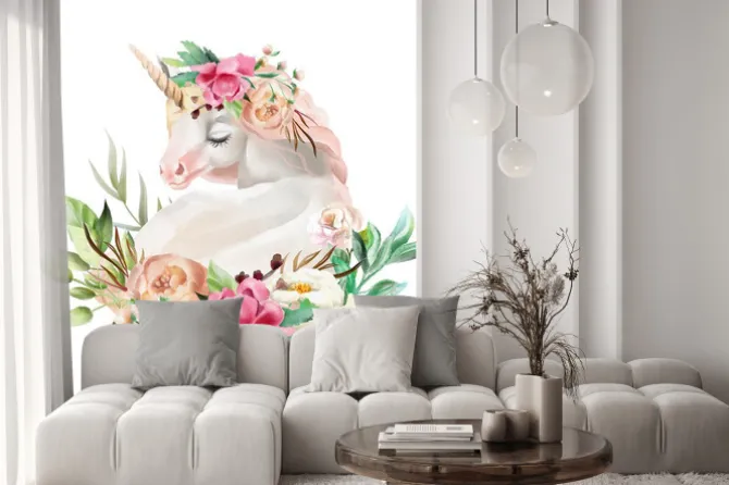 Naklejka: Jednorożec w kompozycji kwiatowej dla dzieci