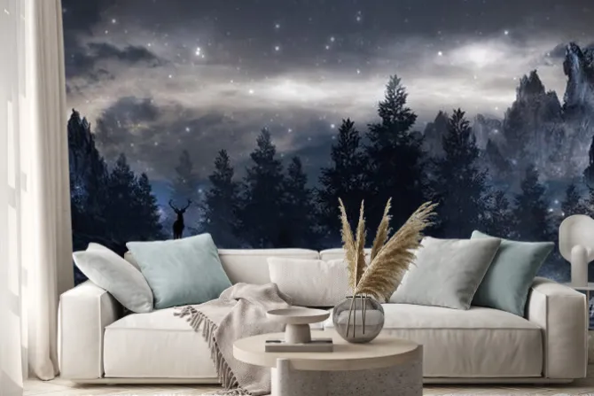 Naklejka: Jeleń wśród drzew nocą pod gwiazdami