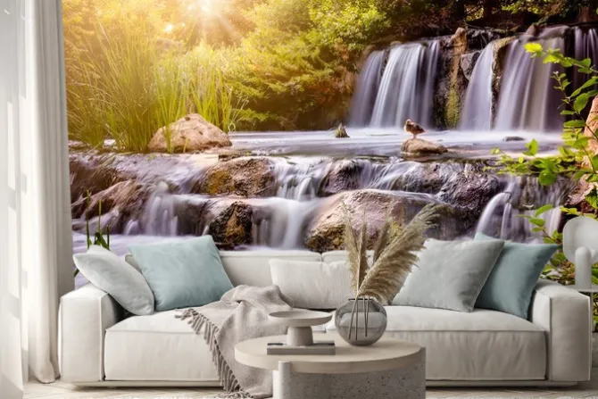 krajobrazy, drzewa, wodospad, las, zieleń, brązowy