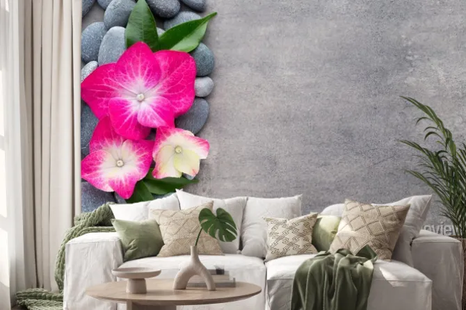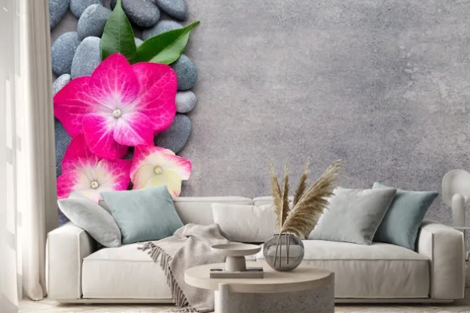 Naklejka: Kamienie i kwiaty spa, na szarym tle.