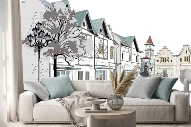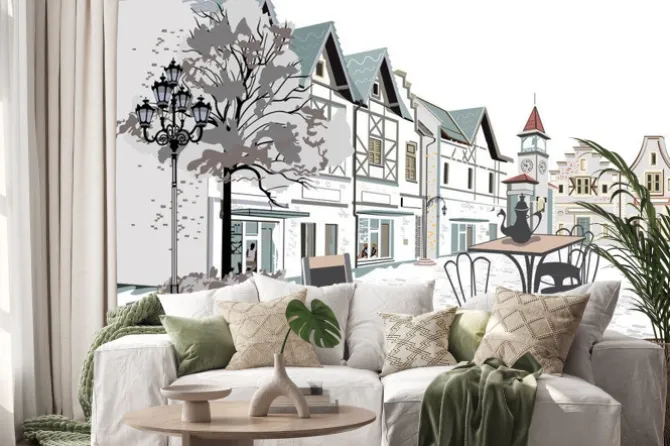 Naklejka: Kawiarenka na starym mieście w stylu akwarelowym