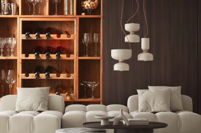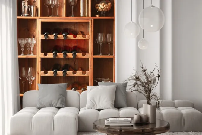 Naklejka: Kieliszki i butelki na drewnianym regale