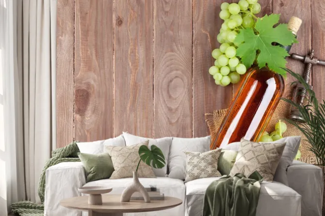 Naklejka: Kiść winogron, butelka białego wina i korkociąg