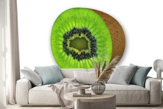 Naklejka: Kiwi w plasterkach, owoc pokrojony w połowie na białym tle