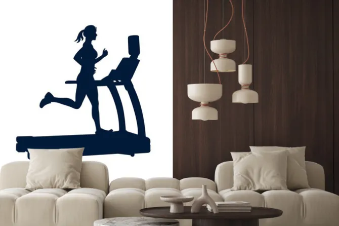 Naklejka: Kobieta robi ćwiczenia na bieżni, na białym tle,