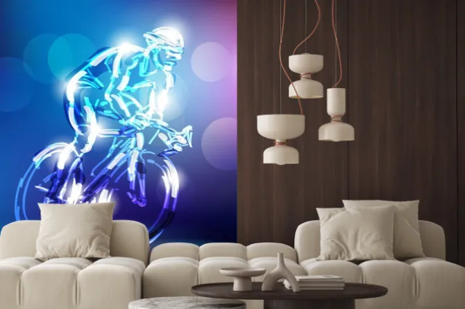 Kolarz na rowerze w odcieniach niebieskiego i fioletowego.