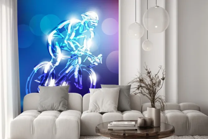 Naklejka: Kolarz na rowerze w odcieniach niebieskiego i fioletowego