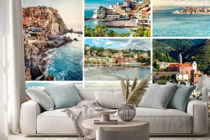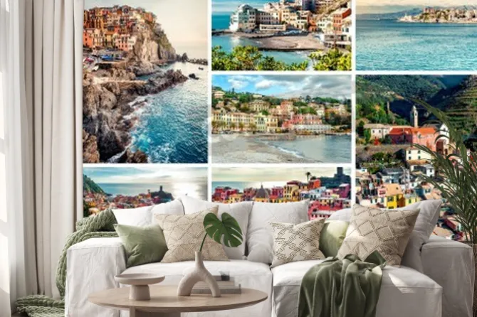 Kolaż z najbardziej znanych zabytków w Włoszech. Riwiera Włoska Genua, Manarola, Vernazza, Bogliasco, Santa Margherita..