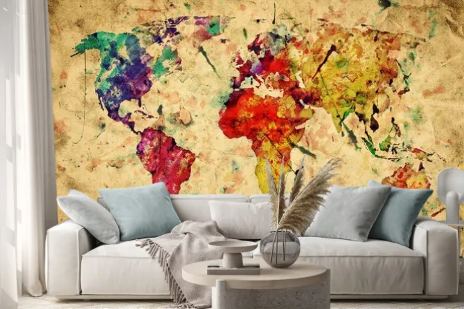 Naklejka: Kolorowa mapa świata malowana akwarelą w stylu vintage