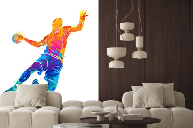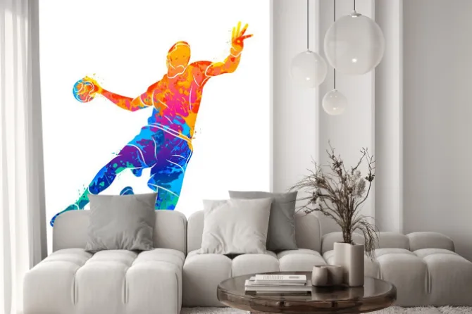 Kolorowa sylwetka sportowca grającego w piłkę ręczną.