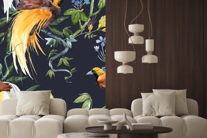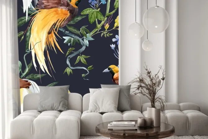 Naklejka: Kolorowe ptaki wśród tropikalnych roślin
