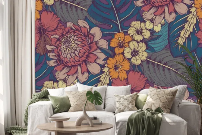 Naklejka: Kolorowe tropikalne liście i kwiaty