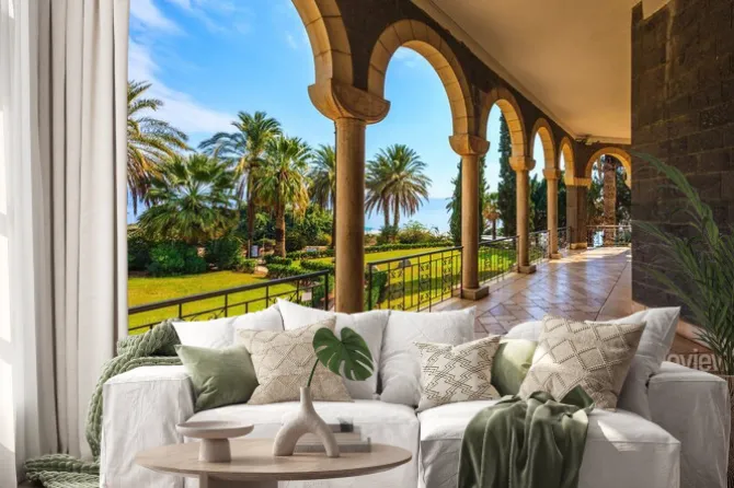 kolumny, drzewa, niebo, morze