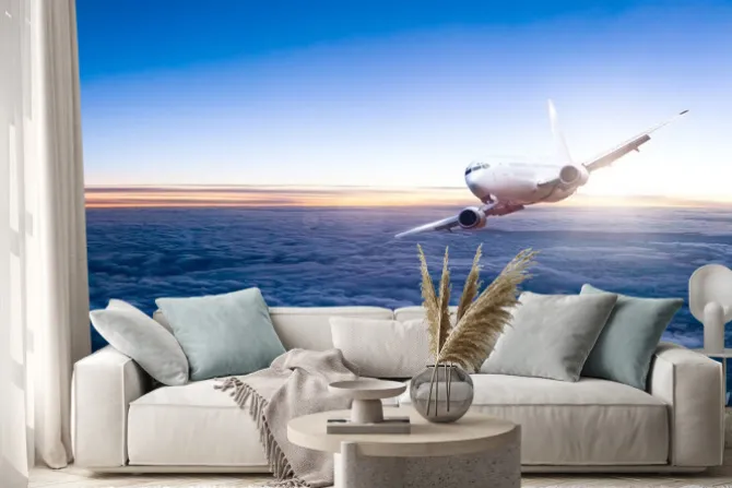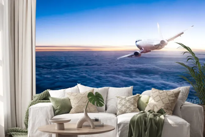 Naklejka: Komercyjne odrzutowy samolot lecący nad chmurami