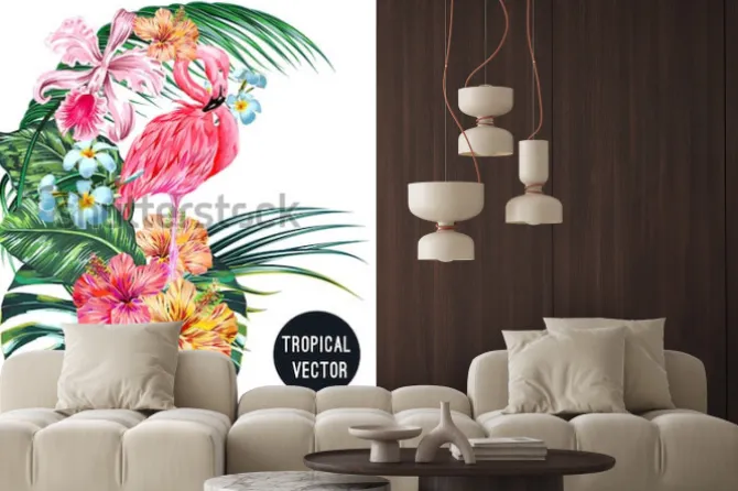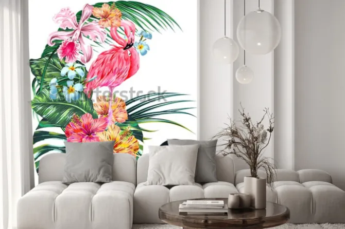 Naklejka: Kompozycja z flamingiem i egzotycznymi roślinami
