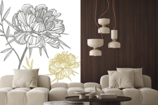 Kontury kwiatów piwonii w czarnym i złotawym odcieniu.