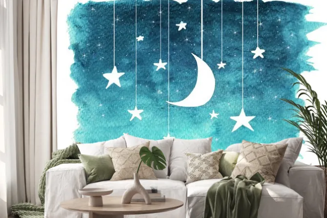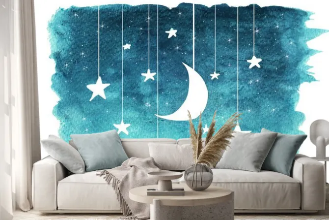 Naklejka: Księżyc i gwiazdy wiesza od sznurków malowaliśmy w akwareli na