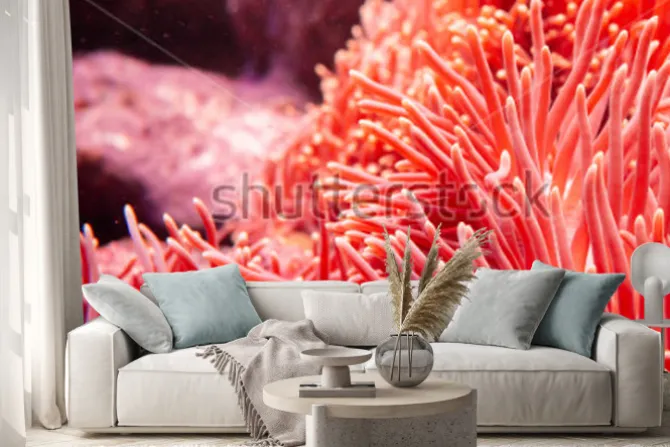 Naklejka: Kwiat morski koral i kolor rafy pod ciemną wodą morskiego środowiska