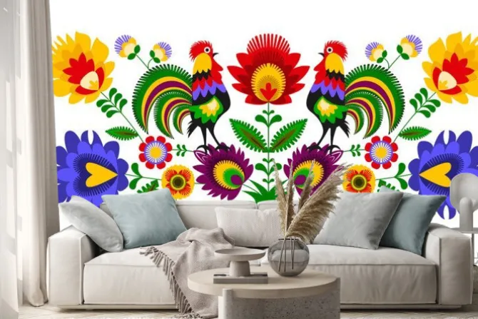 Naklejka: Kwiaty i koguty w stylu folk