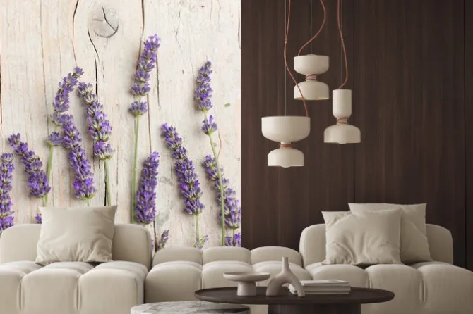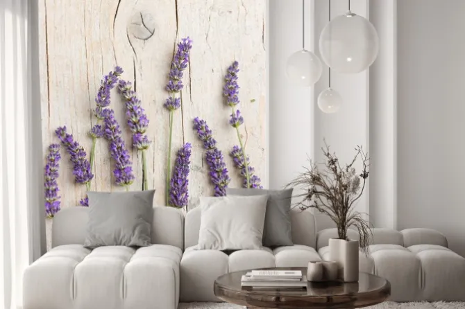 Naklejka: Kwiaty lawendy na jasnym drewnie