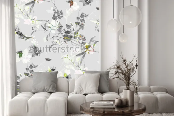 Naklejka: Kwiaty na gałązkach i motyle w szarości