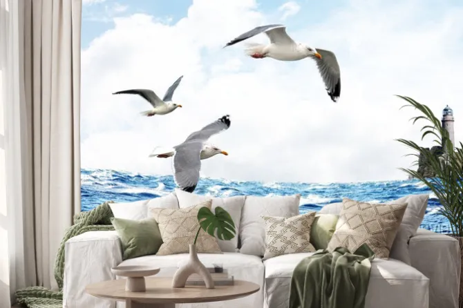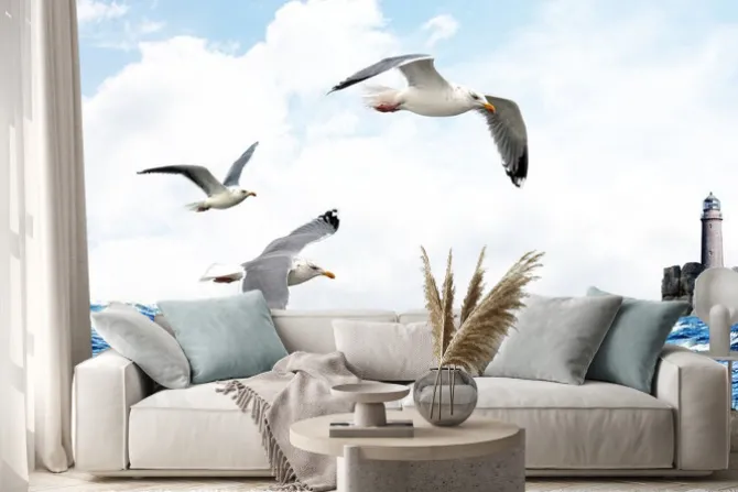 Naklejka: Latające mewy na tle morza i latarni morskiej