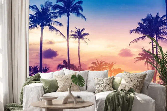 Naklejka: Letni krajobraz palmy na tle kolorowego nieba o zachodzie słońca