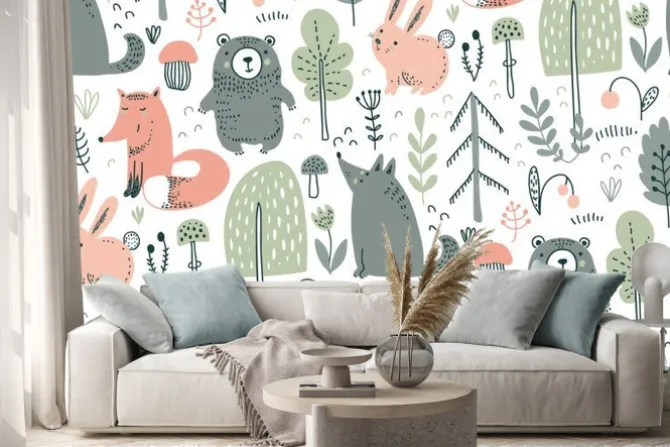 kwiaty, pokój dziecięcy, retro, ptaki, wilk, biały, drewno, drzewa, dekoracyjne