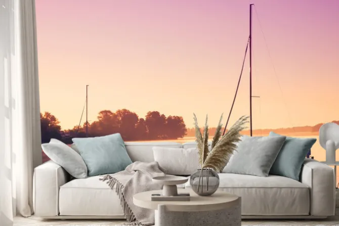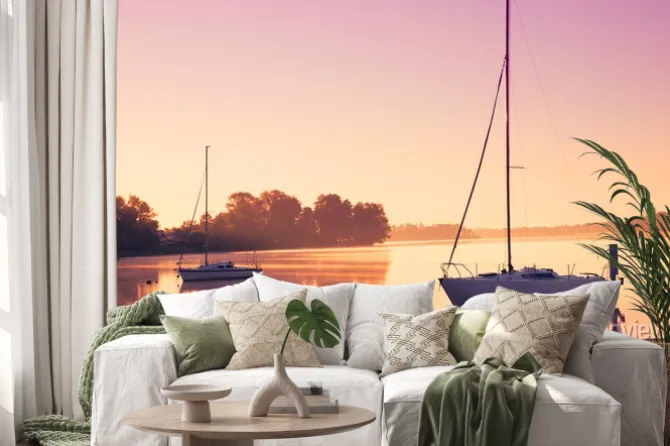 Naklejka: Małe łodzie żaglowe odzwierciedlenia w spokojnej wodzie podczas