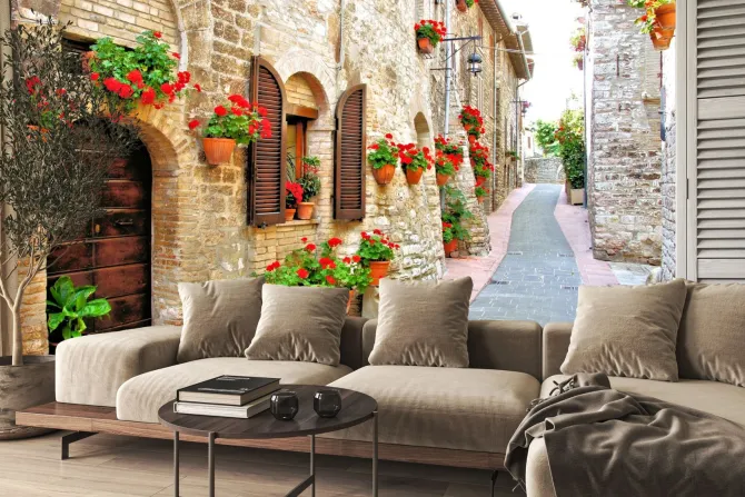 Malowniczy pas z kwiatami we włoskim wzgórzu miasta.