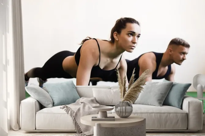 Mężczyzna i kobieta robi ćwiczenia na siłowni desek.