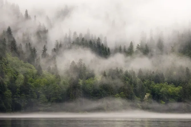 Mglisty pejzaż jeziora otoczonego lasem.