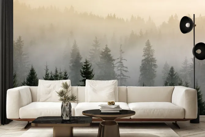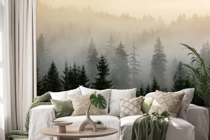 Naklejka: Mglisty poranek nad sosnowym lasem
