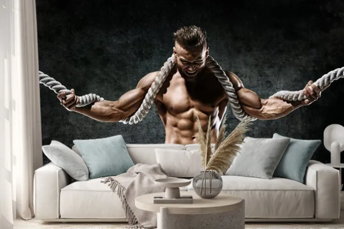 Mięśni człowieka z liny. Zdjęcie człowieka z doskonałym ciałem po treningu. Styl mody.