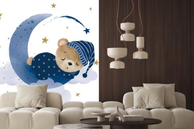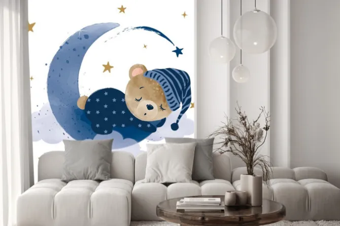 Naklejka: Miś śpiący na księżycu akwarela
