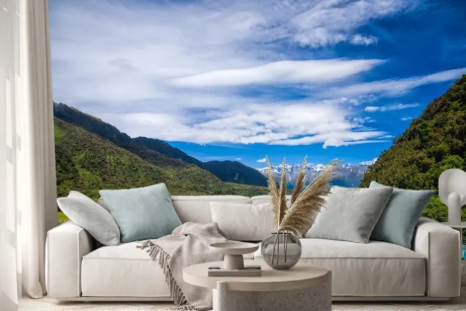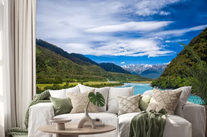 Naklejka: Mleczna niebieski lodowaty wody whataroa river w nowej zelandii
