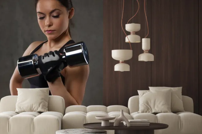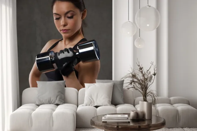 Młoda kobieta wyginanie mięśni z hantlami w siłowni.