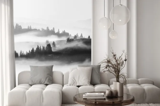 Naklejka: Monochromatyczny pejzaż z lasem we mgle