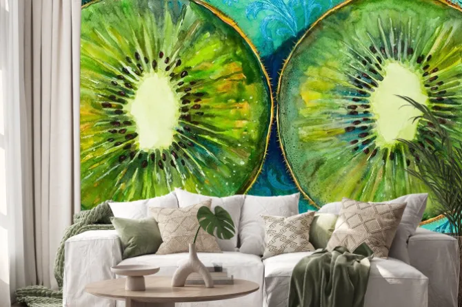 Namalowane kiwi na wzorzystym tle.