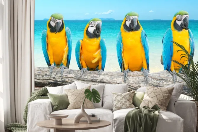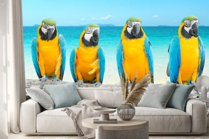 Naklejka: Niebieski i gold ara na tropikalnej pięknej plaży i morza
