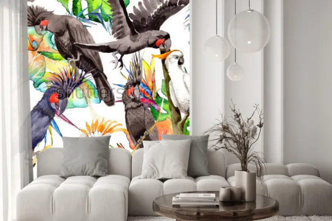 Naklejka: Niebo papa ara ptasi biały wzór stylem akwarela. dziki, ptak