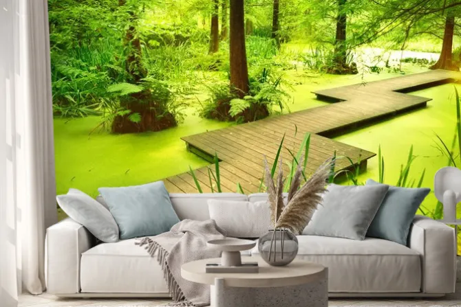 Naklejka: Nowoczesny chodnik lub kładka nad stawem w lesie. starych drzew