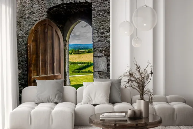 Naklejka: Offenes schweres tor mit blick auf irische landschaft